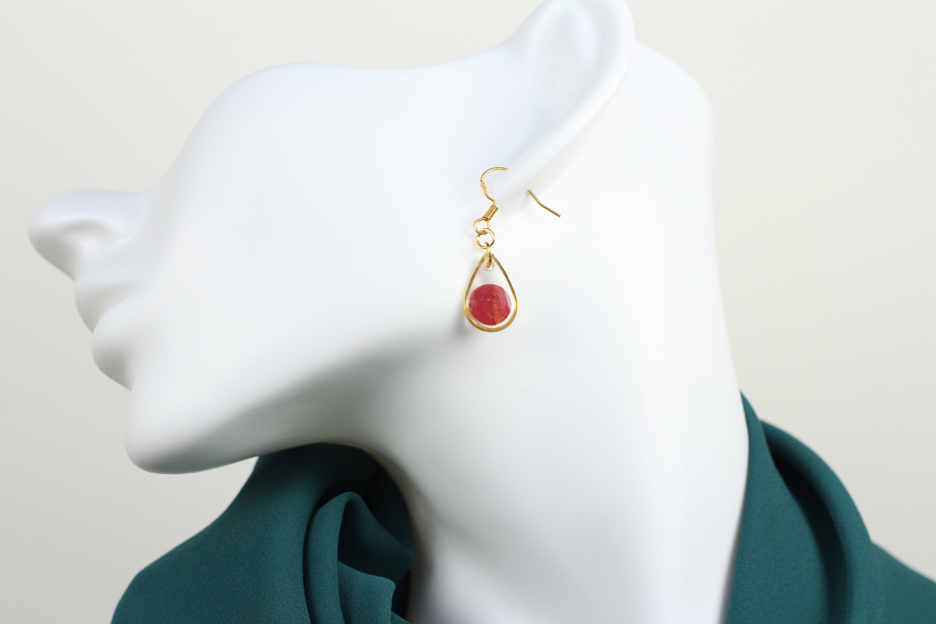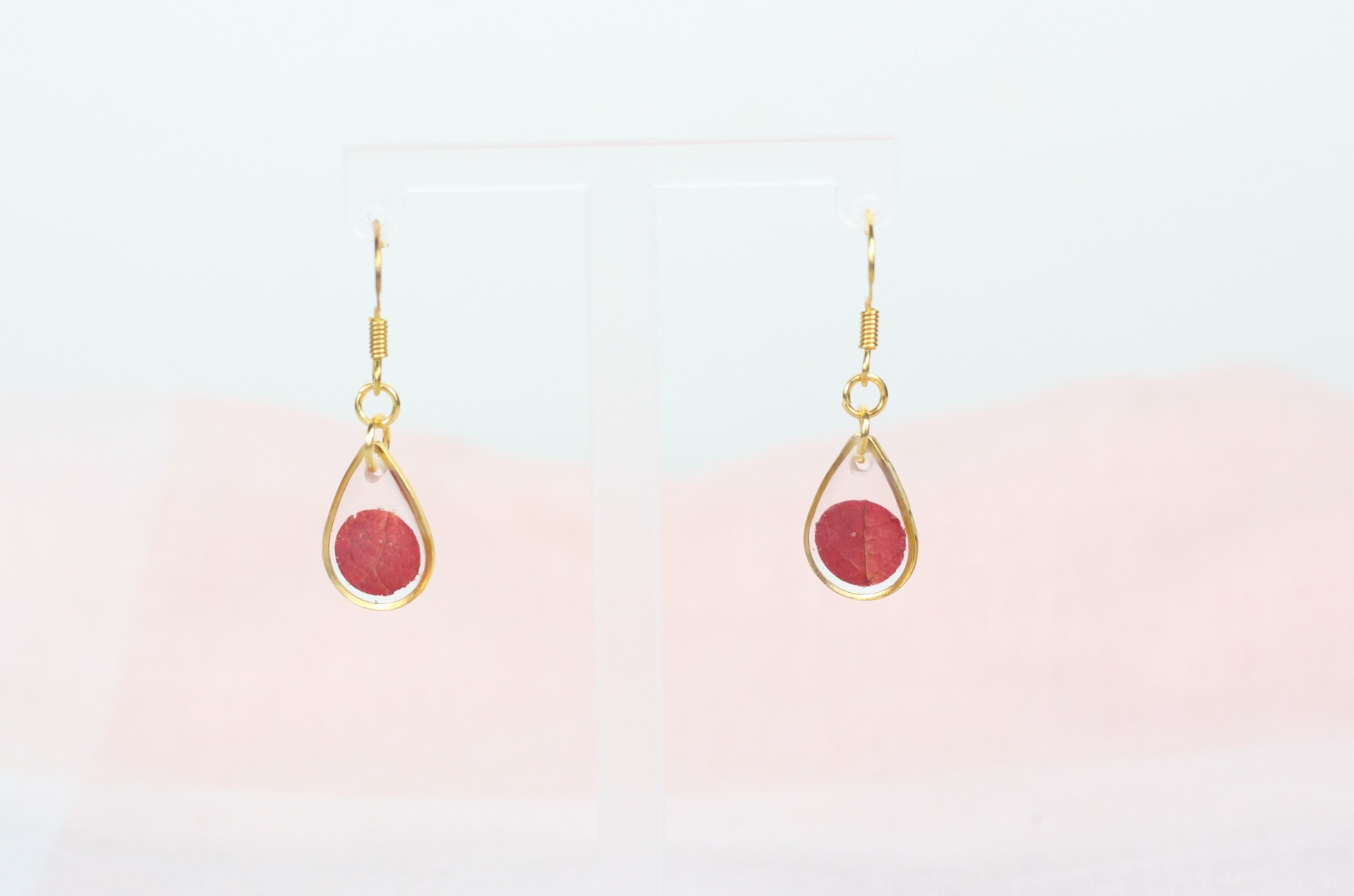 Originele vergulde stainless steel oorbel met een blaadje in verwerkt en een transparante vulling. Mooi contrast door de donkerrode kleur van het blaadje