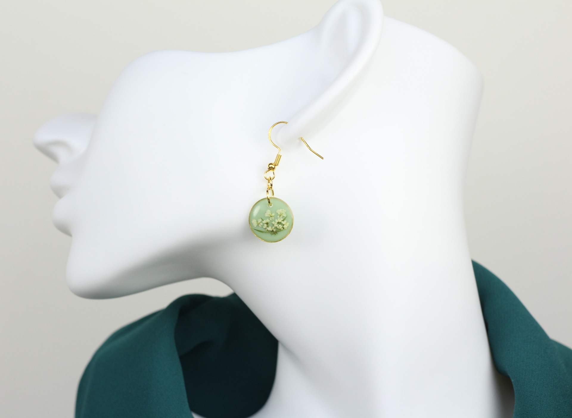 Verfijnde goudkleurige stainless steel oorbel gevuld met een bloempje van Queen Ann's lace (wilde peen) en een olijfgroene achtergrond